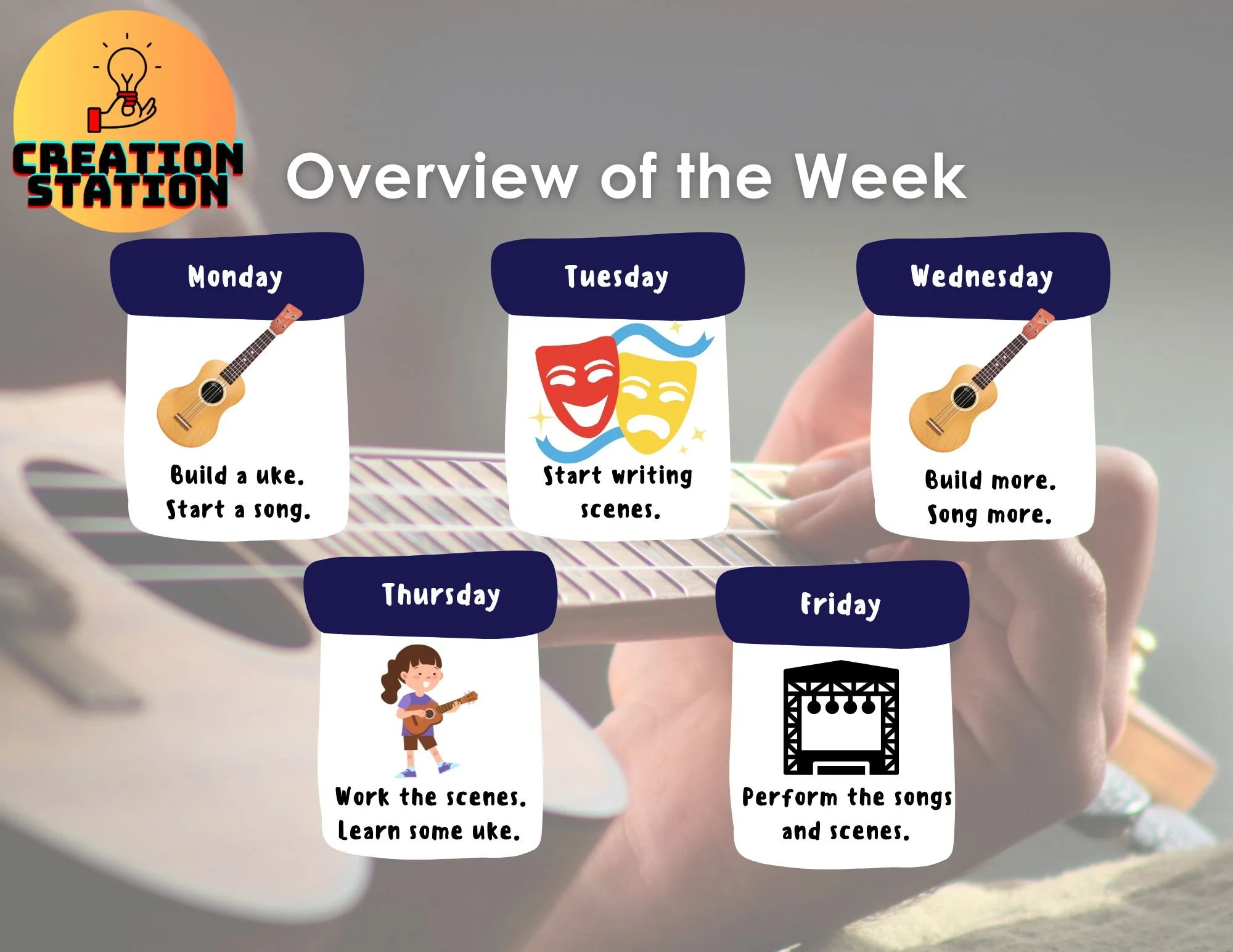 Welcome to the Creation Station. This is where we get to make some really cool stuff! We’ll build a ukulele (one that you get to take home with you at the end of the week!), learn how to write a song, and create our very own theater scenes with all of our new friends.