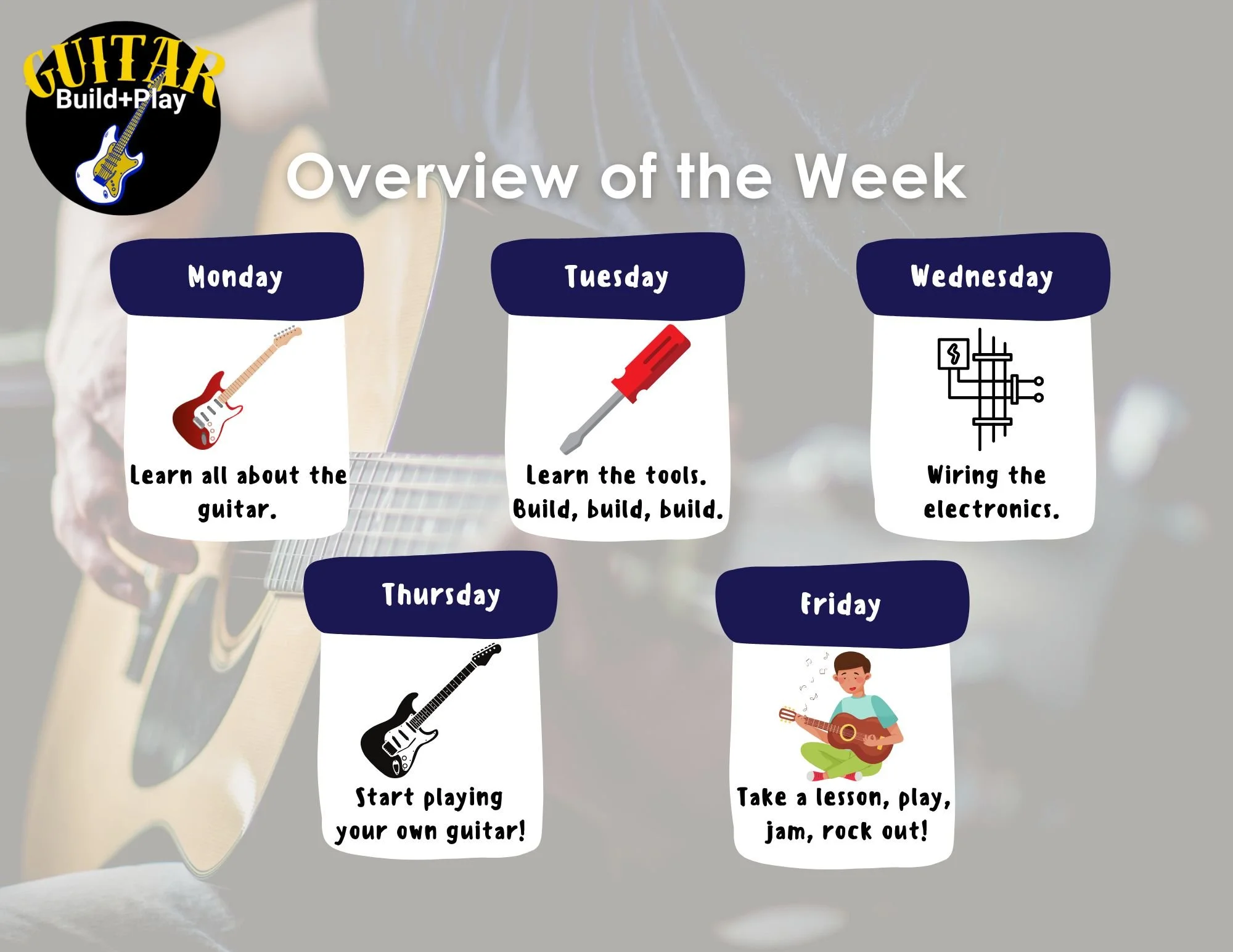 Build your very own guitar from scratch. Under the close guidance of our amazing faculty, learn to use all of the necessary tools (don’t worry - no power tools needed!), assemble and decorate your guitar, and wire the electronics. At the end of the week, learn all the basics that you’ll need to start playing songs!
