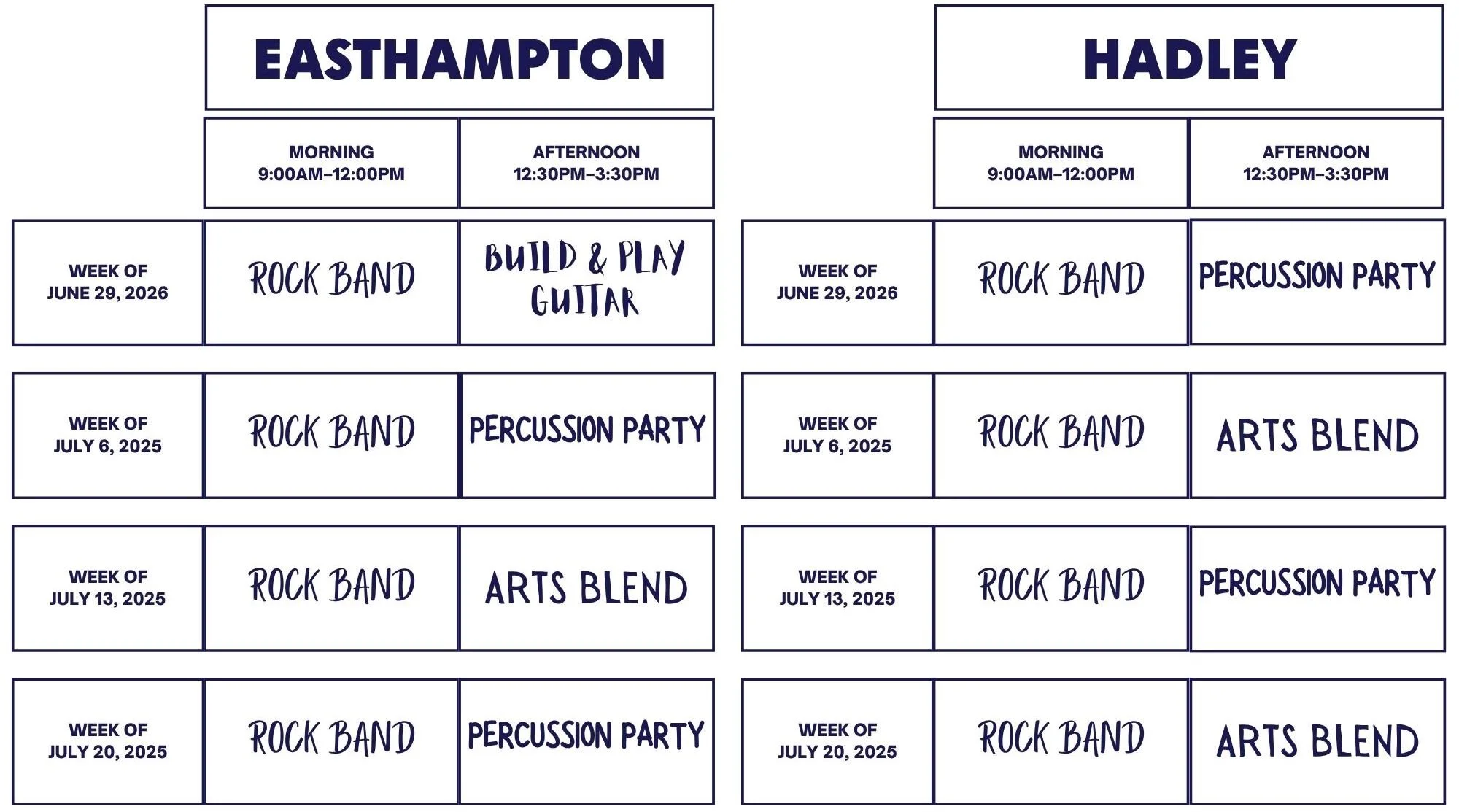 Our band leader program is for instructors in training between the ages of 14 and 16. Leaders participate (at a reduced price) in all program activities with students, but will also help with teaching songs, understanding the instruments, setting up the bands, and much more. No previous experience is needed — we’ll teach them all they need to know! Spots are limited. Contact us at info@theprindleschool.com or 413-341-1689 for additional details or to register a Band Leader!